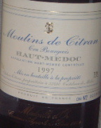 | 3. Moulins de Citran '97 (ムーラン・ドゥ・シトラン、Ch.Citran(クルブルジョア級)のセカンドラベル) Haut-Medoc 色は紫っぽい。はじめは硬かったが、時間とともに開いてきた。頑張って美味しくなっていったが、限界はあった。あ〜比べられてかわいそう。 |