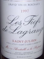 | 4. Les Fiefs de Lagrange '97 (レフィエフ・ドゥ・ラグランジェ、Ch.Lagrange(3級)のセカンドラベル) Saint-Julien 若干ザラつきを感じるが、とてもバランスが良く美味しい。色は紫、果実味があり、樽香もほど良くマッチ。時間経過でザラつきと酸味が強くなってきた気がする。 |