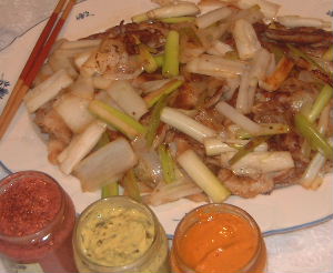 豚肉とねぎのソテー(写真)と3種類(カシス、バジル、ピメントのディジョンマスタード(写真)
